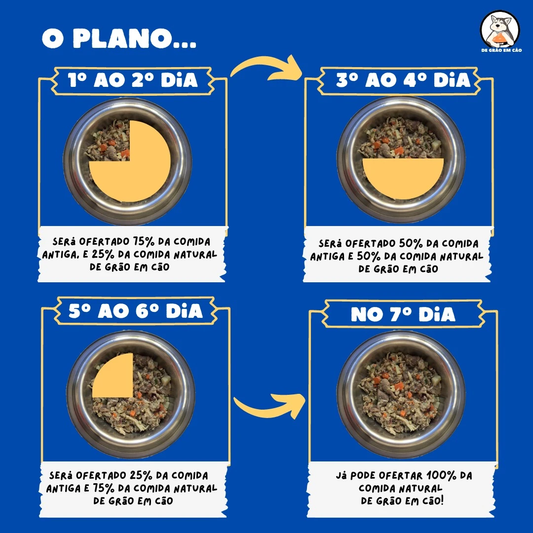 [FAQ-R]É muito importante seguir um protocolo de transição para não ocasionar nenhum desconforto intestinal no animal, e para que essa transição seja sutil, faça-a dessa forma: 1° dia: 75% do alimento antigo e 25% do novo / 3° dia: 50% do alimento antigo e 50% do novo / 5° dia: 25% do alimento antigo e 75% do alimento novo / 7° dia: 100% do alimento novo.
